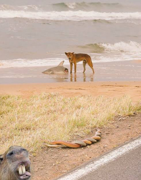 海でヘビの後尾を犬がサメ食いながら見てる画像