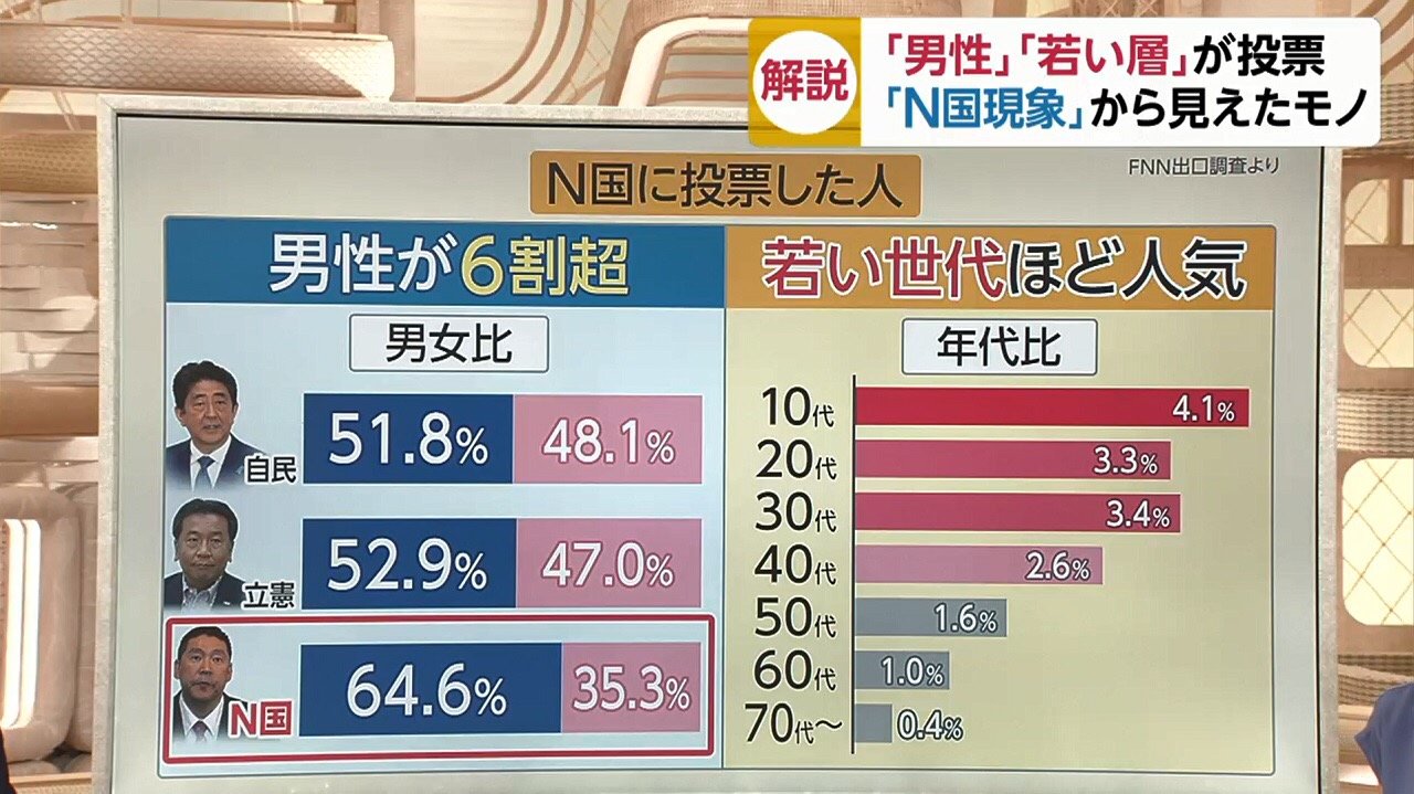 れいわが2議席、N国が1議席を獲得したが、両党が集めた比例票326万余は国民民主の得票と肩を並べる。もちろん、政党要件である「得票率2%以上」も達成した。