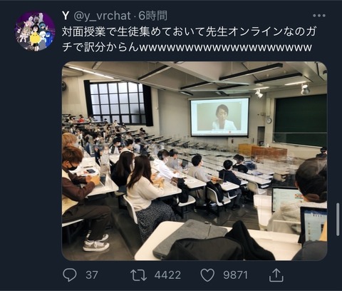 生徒を教室に集めておいて教授はオンラインで出席する模様