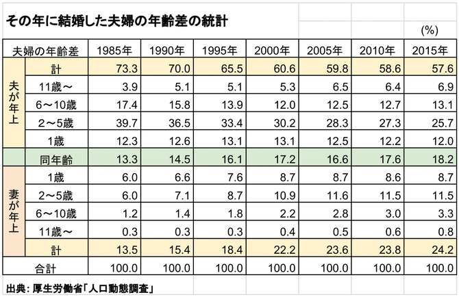 厚生労働省「人口動態統計」による2015年に結婚した夫婦の年齢差