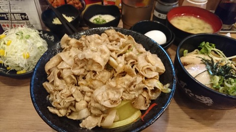 すた丼肉増しダブル、とろろ、チーズ、卵、味噌汁、油そばミニ、サラダ