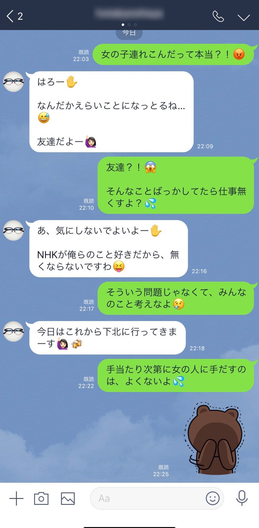 「いいかげんな返事に腹が立ち、《そんなことばっかしてたら仕事無くすよ?》と忠告したのです。そうしたら、彼は《あ、気にしないでよいよー。NHKが俺らのこと好きだから、無くならないですわ》とLINEで言ってのけたんです。