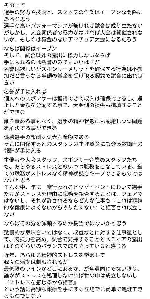 流し読みしたけどスポーツ選手は多くの関係者の上で成り立ってるんだから不満なら金返せってこと?