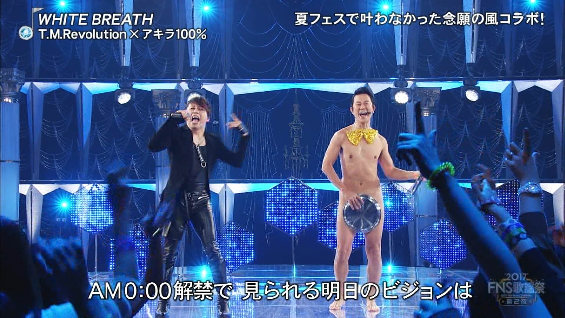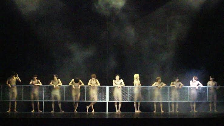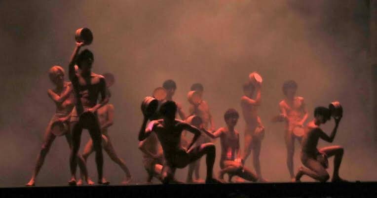 >肌色のパンツ一枚の少年(青年)たちがまず股間の場所が曇りガラスになってるところに一列に並ぶという、まるで全裸といった演出をしたあとに、前に出てきて桶を二つ手に持って股間の部分を交互に桶で隠して踊る。